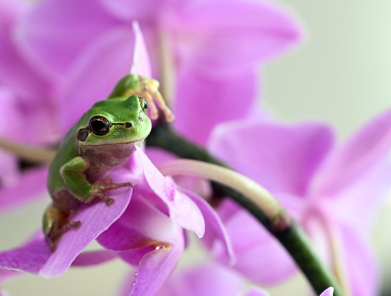 [서울=뉴시스] 경칩을 하루 앞둔 4일 오후 인천 남동구의 한 화원 온실 호접란 위에 청개구리가 앉아 있다.