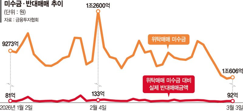 4일 금융투자협회에 따르면 전날 위탁매매 미수금은 1조606억원으로 집계됐다. 올 들어 하루 평균 미수금 규모는 1조378억원으로, 높은 수준을 유지하고 있다. 특히 지난달 4일에는 1조2600억원까지 오르며 미수금이 크게 불어났던 지난 2006년 이후 최대치를 기록했다.