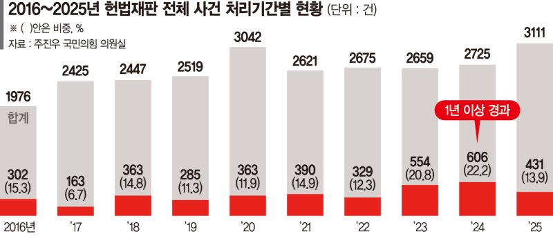 4일 주진우 국민의힘 의원실이 헌법재판소로부터 제출받은 자료에 따르면, 2025년 헌재의 지정재판부(3인으로 구성된 사전심사부)가 각하한 사건을 제외한 본안 사건 628건의 평균 처리기간은 753.2일(약 2년 1개월)로 집계됐다. 이는 전년(724.7일)보다 약 30일 늘어난 수치다.