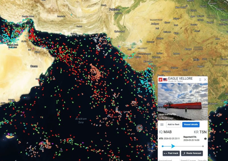 5일 업계에 따르면 선박 이름은 '이글 벨로어(EAGLE VELLORE)'호로, 지난달 26일 이라크에서 약 200만 배럴의 원유를 싣고 출항했다. 이는 한국 하루 원유 소비량에 맞먹는다.