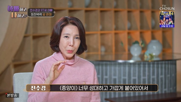 4일 오후 방송된 TV조선 예능 프로그램 '아빠하고 나하고'에서는 뮤지컬 배우 전수경이 '97세' 아버지와의 일상을 공개한 가운데 수술 얘기가 나왔다.