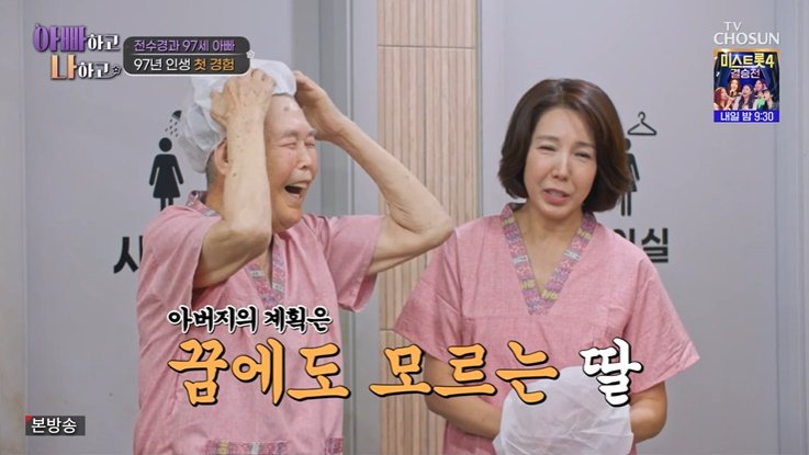4일 오후 방송된 TV조선 예능 프로그램 '아빠하고 나하고'에서는 뮤지컬 배우 전수경이 '97세' 아버지와 함께 효소 찜질방을 찾았다.