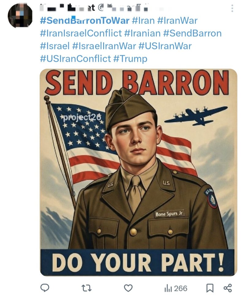 [파이낸셜뉴스] 미국과 이스라엘의 대이란 군사작전으로 미군 사망자가 발생하자 미국 누리꾼들들이 도널드 트럼프 미국 대통령의 막내아들인 배런 트럼프의 입대를 촉구하고 나섰다.
