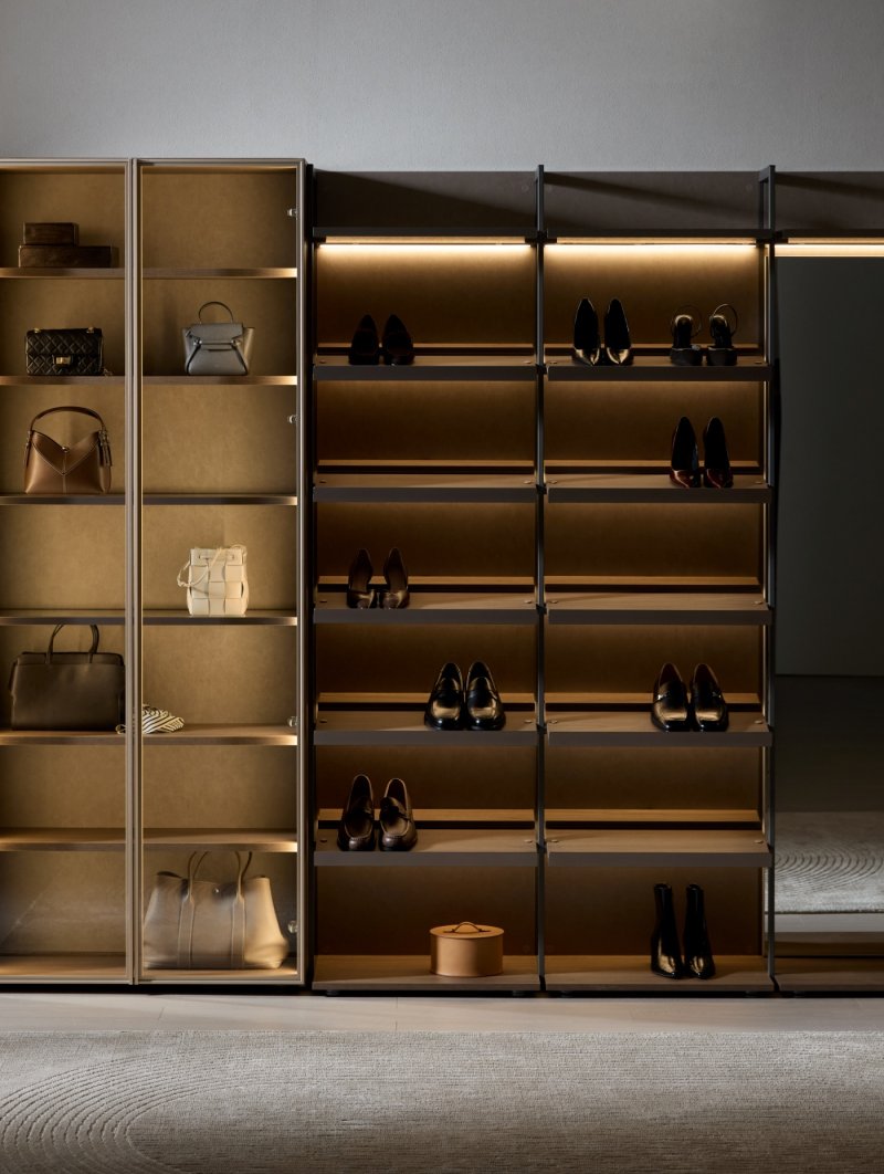 시그니처 드레스룸은 가방이나 소품을 전시하는 컬렉션장과 슈즈랙, 파우더형 모듈, 특수 서랍 등 총 28종의 방대한 모듈을 갖춰 고객의 라이프스타일에 따른 맞춤형 구성이 가능하다.