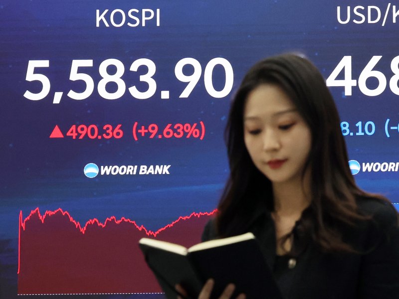 5일 한국거래소에 따르면 코스피는 전일 대비 490.36p(9.63%) 오른 5583.90에 거래를 마쳤다. 전일 대비 3.09% 오른 5250.92로 출발한 지수는 장중 한때 5715.30까지 오르며 12% 넘는 상승률을 기록하기도 했다.