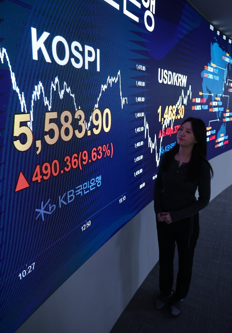 5일 한국거래소에 따르면 이날 코스피는 전 거래일 대비 490.36p(9.63%) 오른 5583.90에 장을 마쳤다. 장중 621p(12.21%)까지 올라 역대 최대 상승폭을 갈아치웠다. 종전 최대 상승폭은 종가 기준으로 지난달 3일 338.41p이다.
