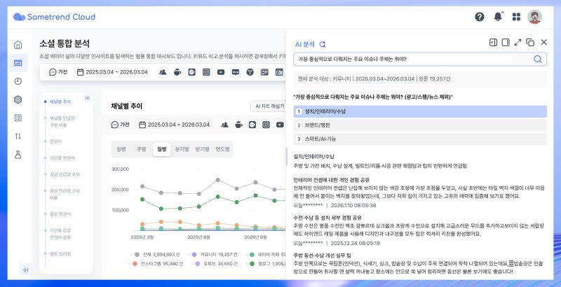 회사 측에 따르면 최근 비즈니스 현장에서는 AI가 제시한 답변을 실무자가 다시 검증해야 하는 이른바 검증 피로도 문제가 제기되고 있다. 썸트렌드 AI는 웹 검색을 통한 단편적인 요약이 아니라, 분석 범위 내의 원천 데이터를 전수 파악한 뒤 이를 기반으로 답변을 생성해 이 같은 한계를 극복했다. 답변과 함께 ▲실시간 언급량 변화 ▲연관어 클러스터 분석 ▲긍·부정 감성 추이 등 계량화된 지표를 동시에 제공하는 것이 특징이라는 설명이다.