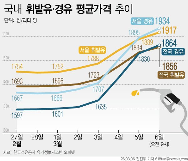 전국 평균 휘발유 가격도 리터당 1856.3원으로 전날보다 22원 상승했다. 최근 국제 석유제품 가격 상승 영향이 국내 주유소 판매 가격에 반영되면서 전국적으로 기름값이 빠르게 오르는 모습이다.