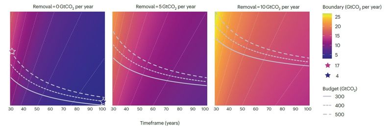지구 평균 온도 상승을 1.5°C 이내로 제한하는 조건에 맞춰 분석한 결과, 지구가 감당할 수 있는 연간 CO₂ 배출 한계는 약 ‘4~17기가톤(Gt CO₂/년)’으로 나타났다. 그러나 현재 인류의 연간 배출량은 약 ‘37기가톤(Gt CO₂/년)’에 달한다. 이는 지구의 안전 작동 범위를 두 배 이상 초과한 수준이다.