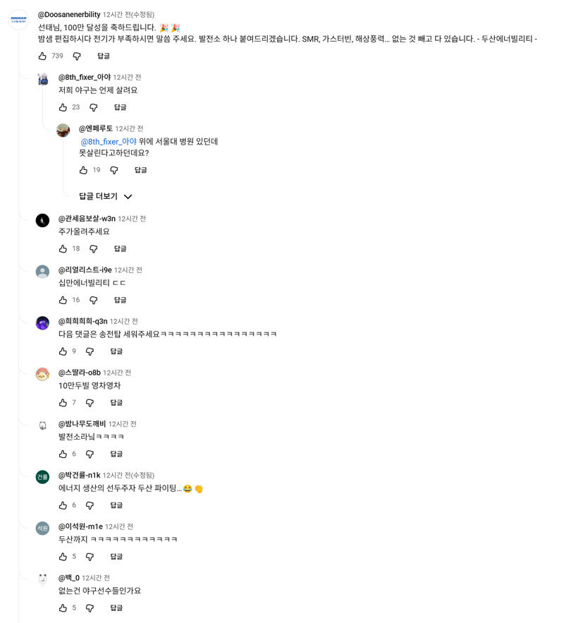 이에 누리꾼들은 "십만에너빌리티ㄷ, 10만두빌 영차영차, 발전소라닠ㅋㅋㅋㅋ, 에너지 생산의 선두주자 두산 화이팅" 등의 반응을 보이고 있다.