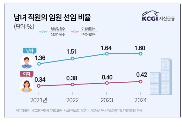 시계열로 보면 일부 업종에서는 격차 완화 움직임도 나타났다. 자산총계 2조원 이상 금융업종의 남녀 급여 비율은 2021년 1.62배에서 2024년 1.39배로 낮아졌고, 소비재·서비스 업종도 같은 기간 1.46배에서 1.29배로 축소됐다. 다만 KCGI자산운용은 이런 변화가 여성의 근속기간 연장과 고위직 진출 확대의 초기 신호일 수는 있지만, 실질적인 양성평등 경영을 위해서는 보상 개선에 그치지 않고 사내이사 등 핵심 의사결정 구조로의 진입 기회 확대가 함께 이뤄져야 한다고 강조했다.