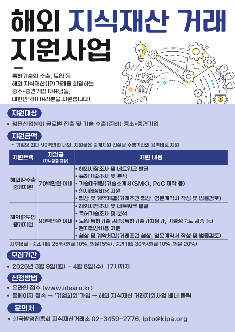 모집 대상은 첨단산업 분야 수출(준비) 중소·중견기업으로, 참여를 희망하는 기업은 ‘아이디어로’를 통해 온라인으로 신청할 수 있으며, 자세한 사업공고는 한국발명진흥회 국가지식재산 거래 플랫폼 공지사항을 통해 확인할 수 있다.
