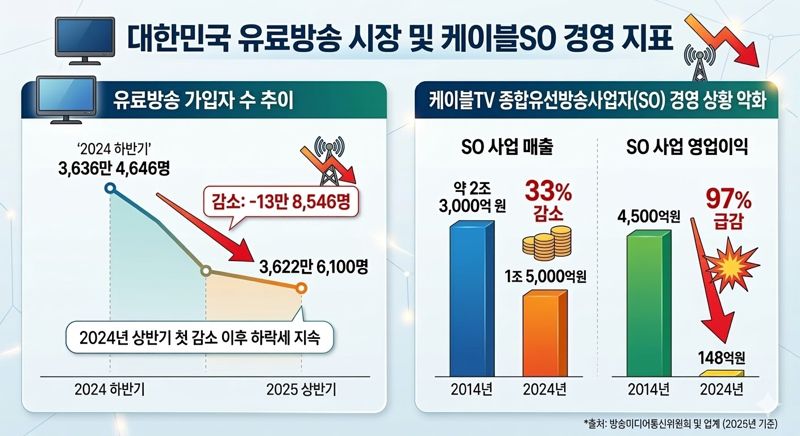8일 업계와 방송미디어통신위원회에 따르면 지난해 상반기 유료방송 가입자 수는 3622만 6100명으로 작년 하반기 대비 13만 8546명이 줄었다. 2024년 상반기에 처음 감소한 이후 하락세가 지속되고 있는 것으로 나타났다.케이블TV 종합유선방송사업자(SO)의 경영 상황은 빠르게 악화되는 모습이다. SO 사업 매출은 2014년 약 2조 3000억원에서 2024년 1조 5000억원으로 33% 감소했다. 같은 기간 영업이익은 4500억원에서 148억원으로 97% 급감했다.