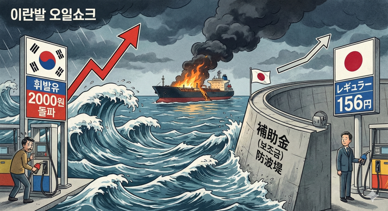 [파이낸셜뉴스] 미국·이란 전쟁발 에너지 위기의 핵심 타깃인 '호르무즈 해협' 원유 의존도는 일본(약 95%)이 한국(약 72%)을 압도한다. 구조적으로 지정학적 리스크에 훨씬 더 취약하다. 그러나 이란 전쟁 발발 직후 주유소 간판에 찍힌 기름값은 정반대를 가리키고 있다. 일주일 새 한국 휘발유 가격이 L당 200원 가까이 폭등하며 2000원 선을 위협하는 동안 일본의 인상 폭은 2.4엔(약 22원)에 그쳤다. 더 치명적인 약점을 안고 있는 일본의 기름값 인상 폭이 오히려 한국의 9분의 1 수준에 불과한 셈이다.