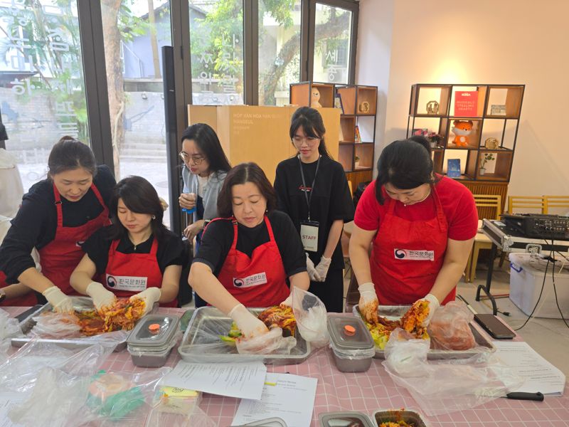 지난 5일 베트남 하노이 소재 한국문화원에서 주베트남 외국군 무관단(MACV) 소속 13개국 무관 및 무관 배우자 21명이 김장 체험을 하고 있다. 무관 및 무관 배우자들은 매달 모임을 갖고 각국의 문화를 소개하는 시간을 가지며 문화교류 행사를 진행하고 있다. 이날 김장 체험에 참가한 이보나 코우팔 주베트남 체코대사관 국방무관 배우자는 "체코에서도 한식이 인기여서 한번 배워보고 싶었는데 이번 기회에 배울 수 있어 너무 즐거웠다"고 소감을 밝혔다.
