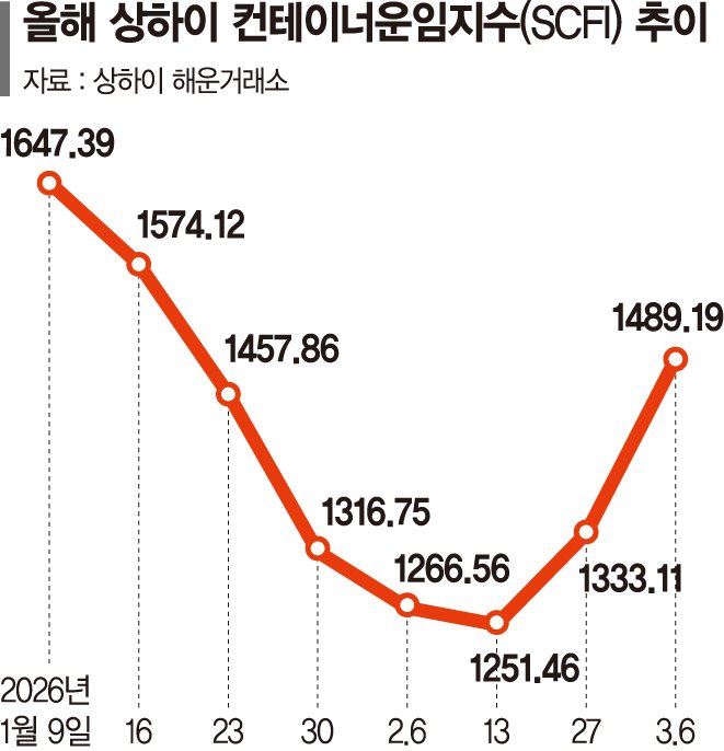 8일 해운업계에 따르면 글로벌 해상운송의 운임 수준을 나타내는 상하이컨테이너운임지수(SCFI)는 지난 6일 기준 전주 대비 156.08p 오른 1489.19를 기록했다. 전주 상승폭인 81.65p의 2배에 달하는 수치다.