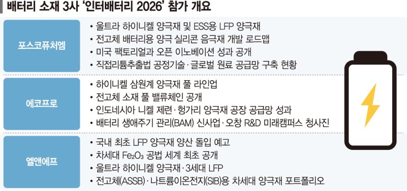 포스코퓨처엠과 에코프로, 엘앤에프 등 국내 배터리 소재 3사가 오는 11일부터 13일까지 서울 강남구 코엑스에서 열리는 '인터배터리 2026'에서 차세대 소재 기술을 일제히 선보인다. 전기차(EV)와 에너지저장장치(ESS)는 물론 휴머노이드 로봇과 인공지능(AI) 데이터센터에 이르기까지 확장된 응용처를 겨냥한 기술 포트폴리오를 소개한다는 계획이다. 특히 세 기업 모두 전고체 배터리 소재와 리튬·인산·철(LFP)·울트라 하이니켈 양극재를 핵심 먹거리로 내세우며 기술 경쟁에 불을 지폈다.