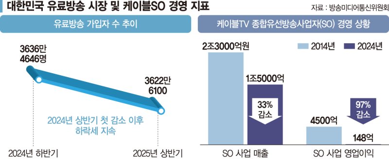 케이블TV 종합유선방송사업자(SO)의 경영 상황은 빠르게 악화되는 모습이다. SO 사업 매출은 2014년 약 2조 3000억원에서 2024년 1조 5000억원으로 33% 감소했다. 같은 기간 영업이익은 4500억원에서 148억원으로 97% 급감했다.