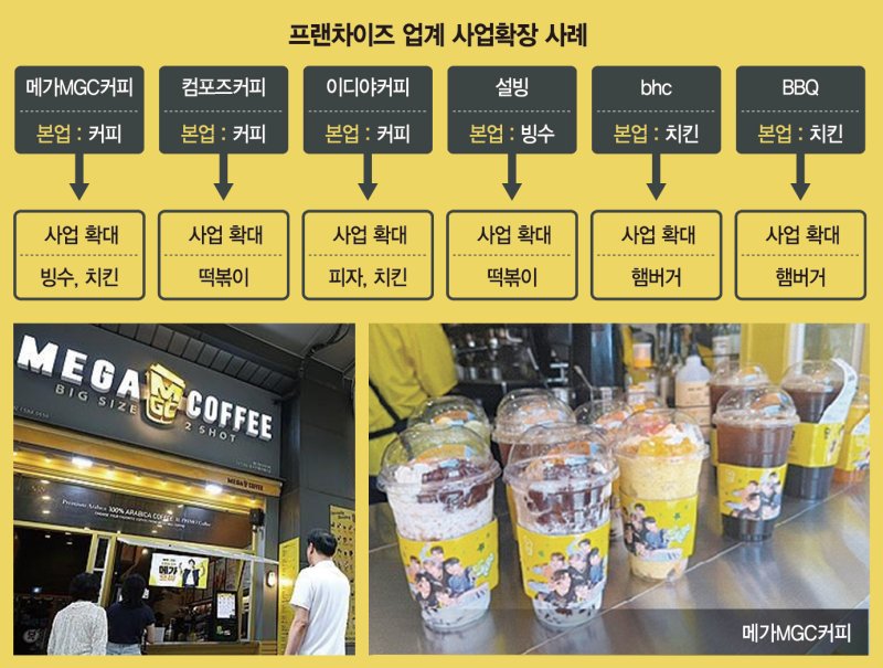 고물가와 성장 둔화 속에서 프랜차이즈 업계가 고유 사업을 넘어 이종 메뉴를 확대하는 '빅블러' 현상이 확산되고 있다. 커피 전문점, 치킨, 디저트 업계를 중심으로 객단가를 높이고 매장 체류 시간을 늘리기 위한 치열한 생존게임이 벌어지고 있는 것이다.