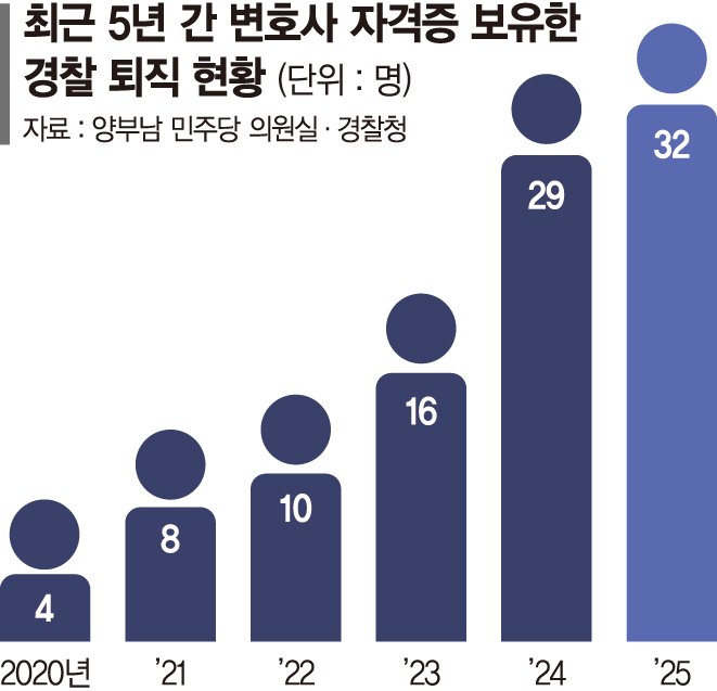 현장에서는 변호사 자격 보유 경찰의 이탈 배경으로 2021년 검경 수사권 조정 이후로 높아진 업무 강도와 낮은 보상 구조를 함께 지목한다. 여기에 로펌 등 법률 시장에서 경찰 수사 경험과 조직 인맥을 갖춘 변호사를 선호하는 흐름까지 겹치며 이직 가능성을 높이고 있다는 분석이다.
