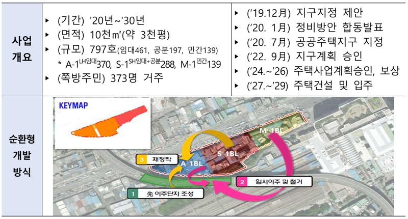사업에는 쪽방 주민 내몰림을 방지하기 위해 선개발 부지에서 먼저 주민 이주와 임대주택 건설을 진행한 뒤 나머지 부지를 개발하는 '순환형 개발 방식'이 적용된다. 주민 재정착을 지원하기 위한 현물보상 제도도 도입됐다.