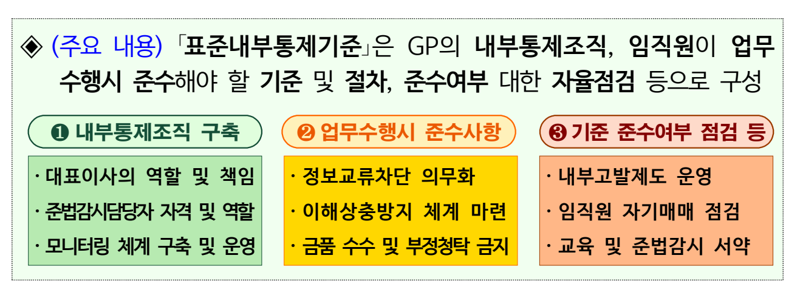 이번에 제정된 표준내부통제기준은 GP의 조직 특성과 고유 리스크를 반영해 크게 △내부통제 조직 구축 △업무수행 시 준수사항 △자율점검 체계로 구성됐다.