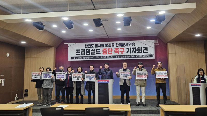 【파이낸셜뉴스 울산=최수상 기자】 민주노총 울산지역본부와 울산자주통일평화연대가 9일 울산시청에서 기자회견을 열고 이날 시작된 한미연합군사연습 '프리덤 실드(FS)'의 즉각 중단을 촉구했다.