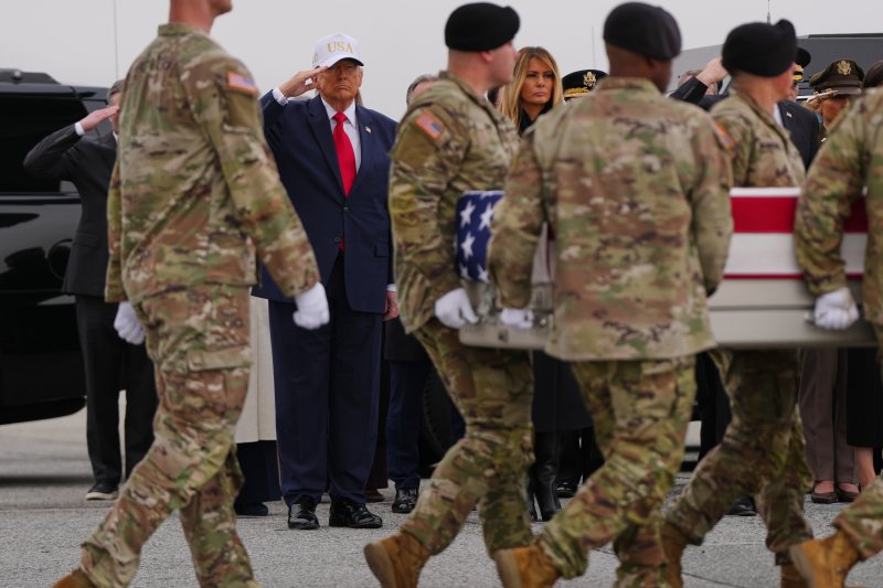 [도버 공군기지(델라웨어)=AP/뉴시스]도널드 트럼프 미국 대통령이 7일(현 지시간) 델라웨어주 도버 공군기지에서 열린 시신 인도식(Dignified Transfer)에서 이란과의 군사 충돌로 쿠웨이트에서 전사한 미군의 유해가 담긴 성조기 덮인 운반함이 이동하는 동안 경례하고 있다. 2026.03.09. [서울=뉴시스] 박영환 기자 = 미국이 이란의 해군 및 미사일 전력 괴멸을 포함한 4대 핵심 군사 목표를 설정하고 공세를 강화하고 있다. 이스라엘과의 전략적 공조 속에 이란 지도부 타격과 핵 시설 무력화가 진행 중이나, 호르무즈 해협 봉쇄에 따른 경제적 파급력이 향후 전쟁의 향방을 가를 주요 변수로 부상했다.