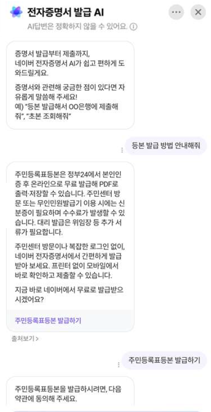 한편 이번 서비스의 핵심 변화는 ▲별도 앱 설치 없이 네이버나 카카오톡에서 대화하듯 행정 업무를 처리할 수 있다는 점 ▲일상 언어로 요청하면 AI가 필요한 서비스를 찾아 연결한다는 점 ▲100여 종 전자증명서 발급과 전국 1200여 개 공공시설 예약을 한 번에 처리할 수 있다는 점이다.