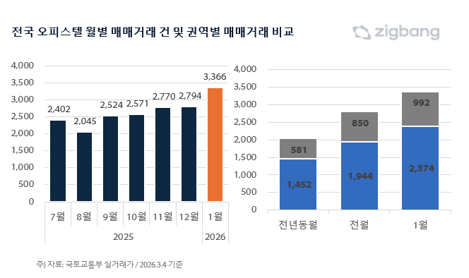 지역별로는 수도권은 2374건, 지방은 992건으로 각각 63.5%, 70.7% 늘며 수도권과 지방 모두에서 거래 증가 흐름이 나타났다.