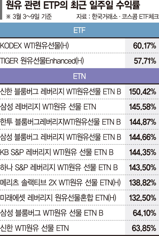 상장지수증권(ETN) 시장에서도 최근 일주일간 수익률 상위 10위권은 모두 원유 관련 레버리지 상품들이 차지했다. '신한 블룸버그 레버리지 WTI원유선물 ETN B'가 일주일간 150.42%나 폭등하며 1위에 이름을 올렸다.