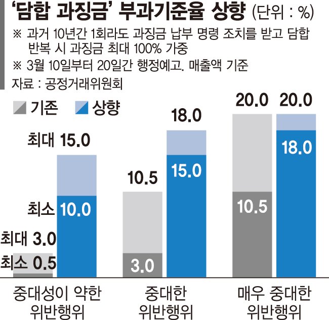 이에 따라 담합의 경우 적발 시 적용되는 부과기준율 하한이 기존 0.5%에서 10%로 크게 올라간다. 중대한 담합은 3%에서 15%로, 매우 중대한 담합은 10.5%에서 18%로 각각 상향된다.