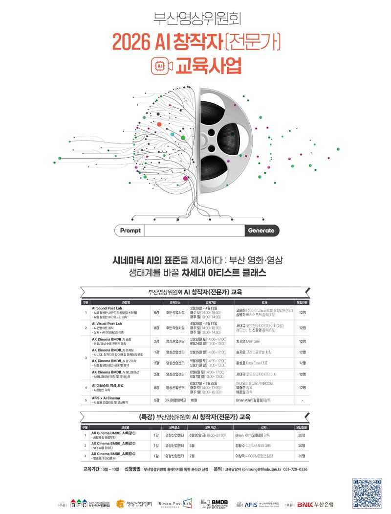 교육 과목은 ‘AI 사운드 포스트 랩’ ‘AI 비주얼 포스트 랩’ ‘AX 시네마 BMDB, 영상 숏폼 제작’ ‘AX 시네마 BMDB, AI 활용 광고 제작’ ‘AX 시네마 BMDB, AI 애니메이션 제작’ ‘AI 아티스트 양성 사업’ 등으로 구성됐다.