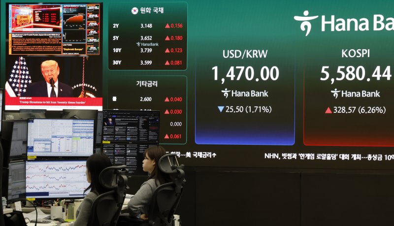 [파이낸셜뉴스] 도널드 트럼프 미국 대통령이 중동 전쟁 종전 가능성을 시사하면서 국내 증시가 강하게 반등하고 있다. 코스피는 10일 장 초반 전 거래일 대비 6% 넘게 오르며 5580선을 회복했다. 전날 6% 가까운 급락에 따른 낙폭 과대 인식이 매수심리를 자극한 가운데 간밤 뉴욕 3대 지수가 일제히 상승 마감한 것이 반등 동력으로 작용했다.