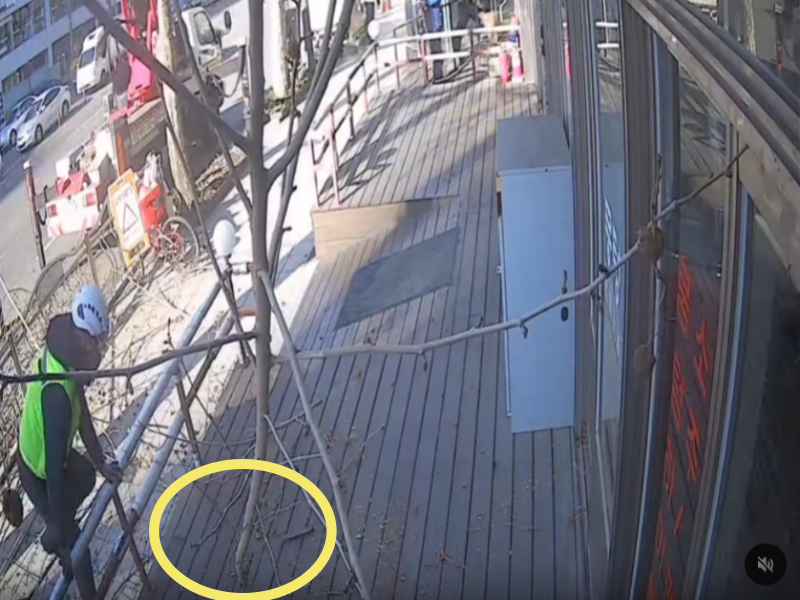 공개된 CCTV 영상에는 전날인 7일 작업자들이 인도 가로수 가지치기를 하던 중 큰 나뭇가지가 떨어져 데크 바닥에 내리 꽂히는 장면이 담겼다.