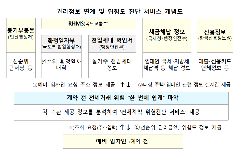 먼저 전세계약 전 선순위 권리정보 등 위험 진단 정보를 통합 제공한다. 현재까지 예비 임차인은 임대주택의 선순위 권리정보를 얻기 위해 계약 전 임대인의 동의를 얻어 다수의 관공서를 방문해야 하는 등 복잡한 절차를 거쳐야 했다.