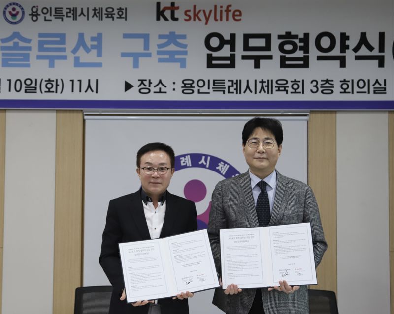 용인특례시체육회 회의실에서 열린 이날 협약식에는 KT스카이라이프 이석호 수도권고객본부장과 용인특례시체육회 오광환 회장이 참석했다. 이들은 AI 스포츠 중계 시스템 구축, 용인특례시 스포츠 행사 중계, 생활체육 활성화 등 협력을 약속했다.