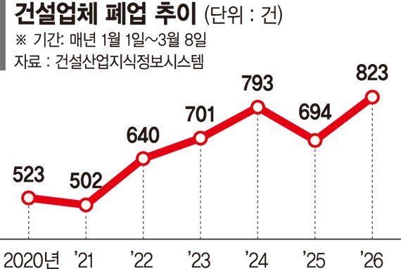 건설경기 침체가 장기화되며 건설사 폐업은 점차 빠르게 늘어나는 추세다. 같은 기간만 떼서 보면 △2020년 523건 △2021년 502건 △2022년 640건 △2023년 701건 △2024년 793건 △2025년 694건 등이다.