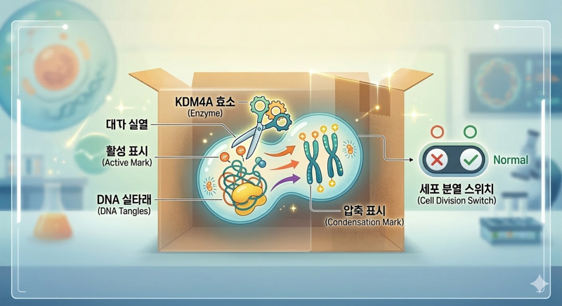 연구팀은 실험을 통해 평소 유전자를 작동시키던 '활성 표시'가 세포 분열 초기 단계에서 급격히 사라진다는 사실을 확인했다. 이때 이 표시를 정확하게 잘라내는 가위 역할을 하는 효소가 바로 KDM4A다. 실제로 연구팀이 실험실에서 이 효소의 힘을 약하게 만들자, 평소라면 사라졌어야 할 표시들이 정상적인 세포보다 2배 이상이나 많이 남아 있었다.