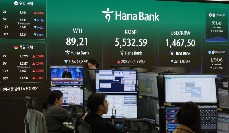 11일 한국거래소에 따르면 전날 코스피 지수는 전 거래일보다 280.72포인트(5.35%) 오른 5532.59에 마감했다.
