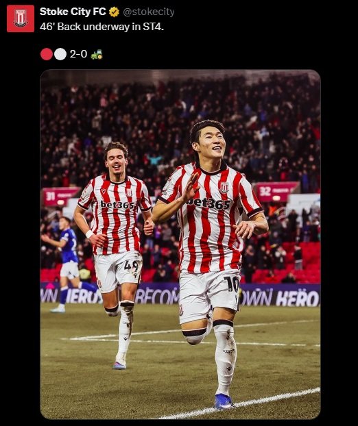 스토크는 11일(한국 시간) 영국 스토크온트렌트의 베트365 스타디움에서 열린 입스위치와의 2025~2026시즌 잉글랜드 챔피언십 37라운드 홈 경기에서 3-3 무승부를 거뒀다.
