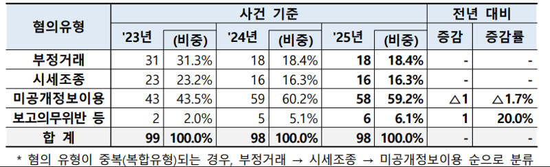 혐의별로는 미공개정보이용 사건이 58건(59.2%)로 가장 높은 비중을 차지했고, 부정거래 18건(18.4%), 시세조종 16건(16.3%) 순으로 집계됐다.