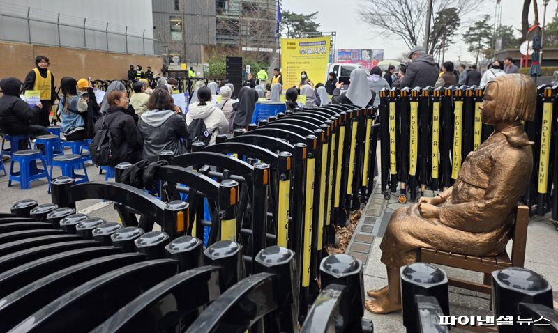 이날 강경란 정의연 연대운동국장은 파이낸셜뉴스와의 현장 인터뷰에서 "모든 시민에게 열려 있어야 할 소녀상 공간이지만, 극우 단체가 집회를 재개하겠다고 하니 걱정"이라며 "위안부피해자법이 통과된 뒤에도 똑같은 일이 벌어지는 것은 용납할 수 없어 바리케이드 철거 시기를 재검토하는 중"이라고 말했다. 해당 바리케이드는 극우 단체 집회로부터 소녀상을 보호하고자 2020년 6월 설치됐다.