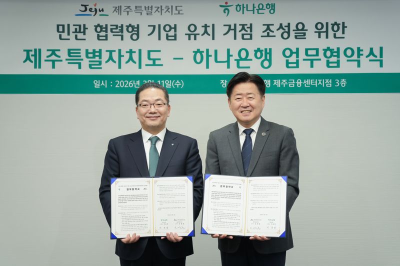 【파이낸셜뉴스 제주=정용복 기자】 제주특별자치도와 하나은행이 협력해 제주 이전 기업의 초기 정착을 지원하는 기업 유치 거점을 조성한다. 기업 유치 경쟁이 치열해지는 가운데 금융 인프라와 공간을 결합한 민관 협력 모델을 통해 투자 유치 기반을 강화한다는 구상이다.