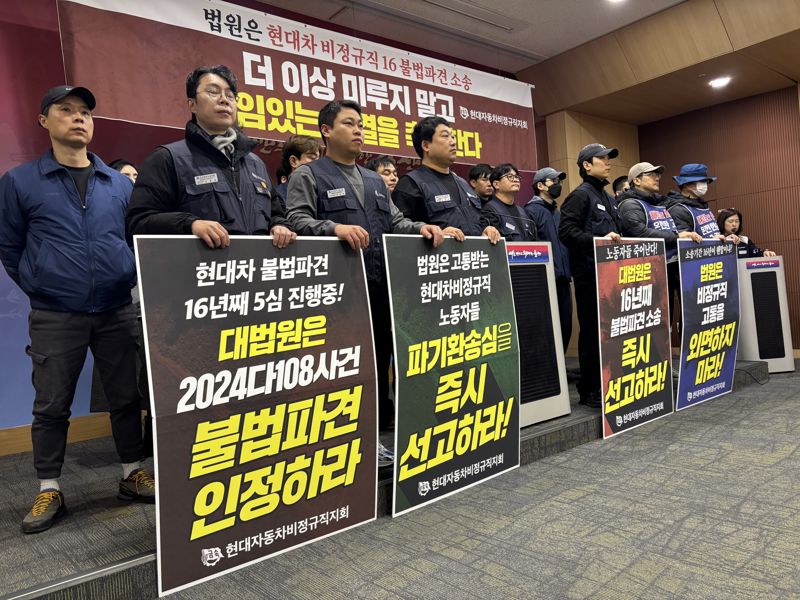 【파이낸셜뉴스 울산=최수상 기자】 현대자동차 사내하청 노조는 11일 울산시청 프레스센터에서 기자회견을 열고 16년 전 제기한 사내하청 노동자 불법파견 및 근로자 지위 확인 소송에 대한 조속한 판결을 촉구했다.