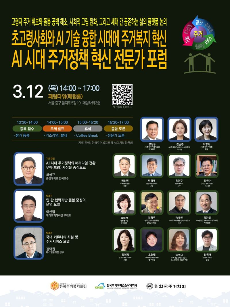 포럼은 기조강연 등 주제발표와 종합토론으로 진행된다. 주제발표에서는 하성규 중앙대 명예교수가 'AI시대 주거정책의 패러다임 전환'을 주제로 기조강연에 나선다. 이어 이선엽 케어오퍼레이션 부대표가 '민관 협력기반 돌봄 중심의 운영 모델' 발표를 진행한다.
