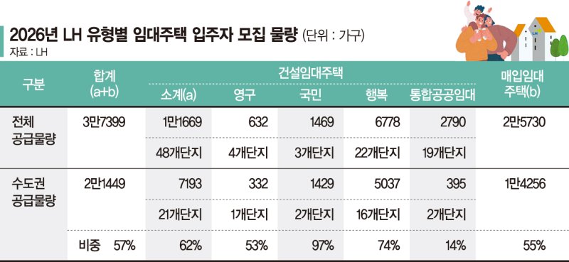 11일 LH에 따르면 올해 공급 물량은 건설임대주택 1만1000가구와 매입임대주택 2만6000가구로 구성된다. 이는 지난해 공급 실적 3만1000가구보다 6000가구(약 19%) 늘어난 규모다. 특히 주택 수요가 집중된 수도권에 전체 물량의 약 57%인 2만1000가구가 공급될 예정이다.