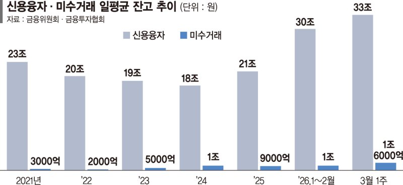 금감원에 따르면 지난 6일 기준 신용융자 잔고는 32조8000억원으로 집계됐다. 이는 2025년 말 21조원이었던 것과 비교해 불과 3개월 만에 10조원 이상 급증한 수치다. 시가총액 대비 비중은 0.6% 수준으로 과거(2021년 0.9%)보다 낮지만, 절대적인 금액 규모가 커지면서 시장 변동성 발생시 충격파가 커질 수 있다는 우려가 나온다.