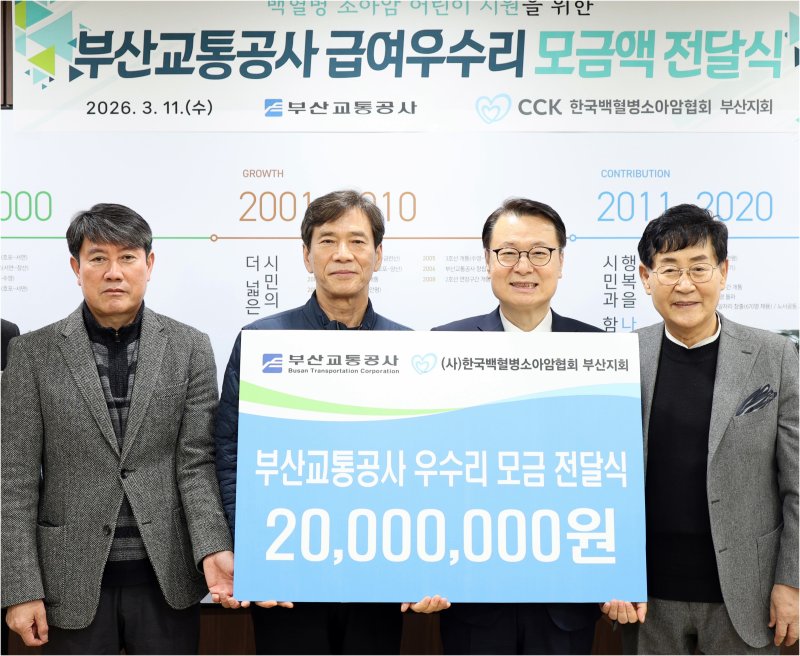이날 공사 본사 7접견실에서 열린 '급여 우수리 모금액 기탁 행사'에는 공사 이병진 사장, 박명도 경영지원본부장과 한국백혈병소아암협회 윤형주 부회장, 박동호 부산지회장 등 두 기관 관계자가 참석했다. 전달한 성금은 부산과 경남 지역에 거주하는 소아청소년암 환아들의 치료비 지원에 전액 사용될 예정이다.
