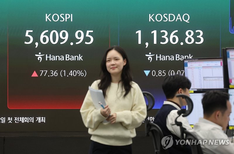 지난 11일 유가증권시장에서 코스피는 전장보다 77.36포인트(1.40%) 오른 5,609.95에 마감했다.